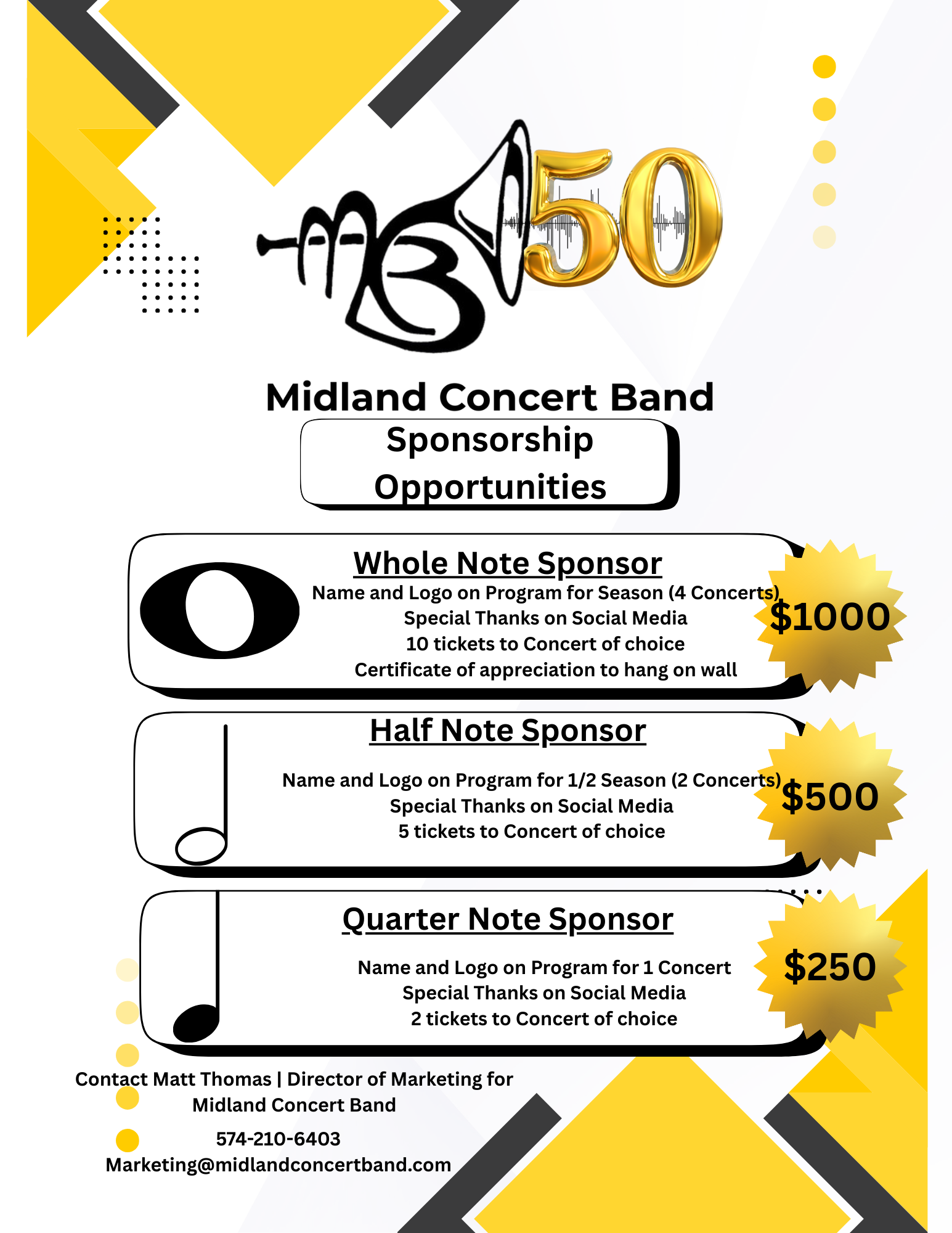 Boost your brand's visibility and connect with the community by sponsoring the Midland Concert Band! Your support will help us create unforgettable musical experiences while showcasing your commitment to the arts. Enjoy unique advertising opportunities, reach a diverse audience, and enhance your company's reputation. Sign up today to be part of something special—music brings people together, and your sponsorship can make a real difference! Join us in celebrating talent and community spirit. Partner with us, and let’s make beautiful music happen!